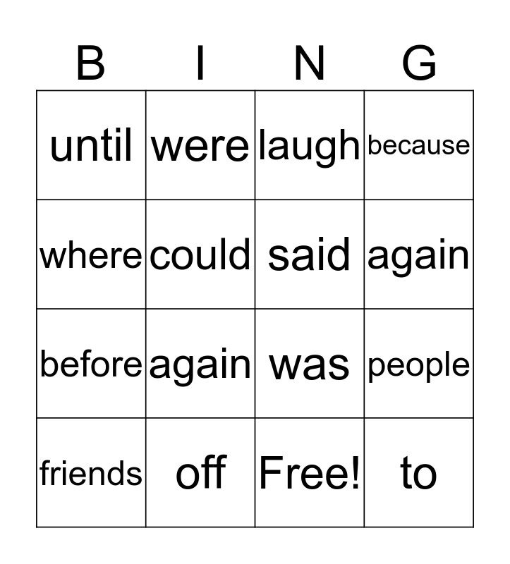 This bingo card has 17 words: Free!, friends, laugh, until, again, because, people, said, again, could, off, was, where, were, before, into and to.