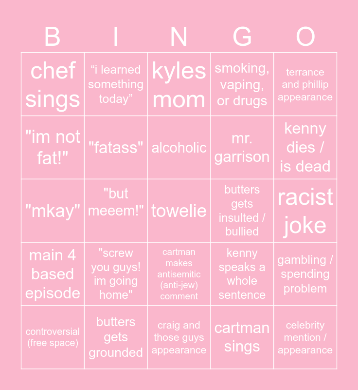 This bingo card has 29 words: controversial (free space), butters sings, "but meeem!", celebrity mention / appearance, chef sings, kyles mom, "fatass", "screw you guys! im going home", butters gets insulted / bullied, butters gets grounded, racist joke, towelie, craig and those guys appearance, cartman sings, kenny dies / is dead, randy based episode, cartman makes antisemitic (anti-jew) comment, main 4 based episode, terrance and phillip appearance, "mkay", kenny speaks a whole sentence, the emo kids, mr. garrison, "im not fat!", smoking, vaping, or drugs, “i learned something today”, gambling / spending problem, alcoholic and satan.