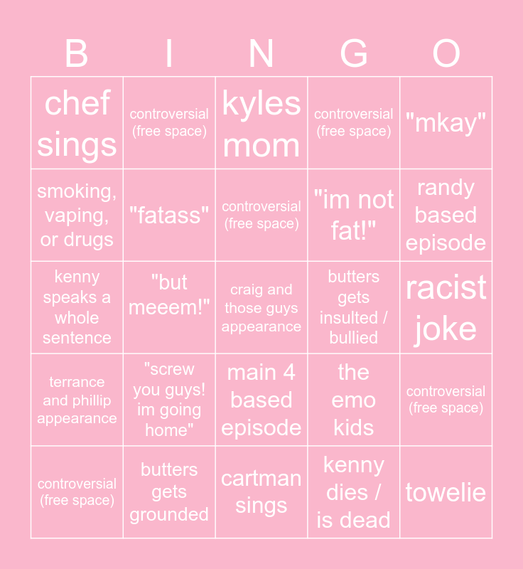 This bingo card has a free space and 29 words: controversial (free space), butters sings, "but meeem!", celebrity mention / appearance, chef sings, kyles mom, "fatass", "screw you guys! im going home", butters gets insulted / bullied, butters gets grounded, racist joke, towelie, cartman sings, kenny dies / is dead, randy based episode, cartman makes antisemitic (anti-jew) comment, main 4 based episode, terrance and phillip appearance, "mkay", kenny speaks a whole sentence, the emo kids, mr. garrison, "im not fat!", smoking, vaping, or drugs, controversial (free space), controversial (free space), controversial (free space), controversial (free space) and controversial (free space).