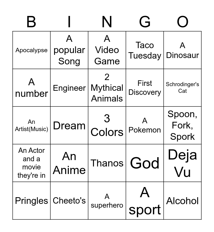 This bingo card has a free space and 24 words: An Anime, Cheeto's, 2 Mythical Animals, Pringles, A Dinosaur, Apocalypse, A number, A popular Song, A Pokemon, Thanos, First Discovery, An Artist(Music), God, Deja Vu, Engineer, A sport, Spoon, Fork, Spork, A Video Game, Schrodinger's Cat, Dream, Alcohol, An Actor and a movie they're in, Taco Tuesday and A superhero.
