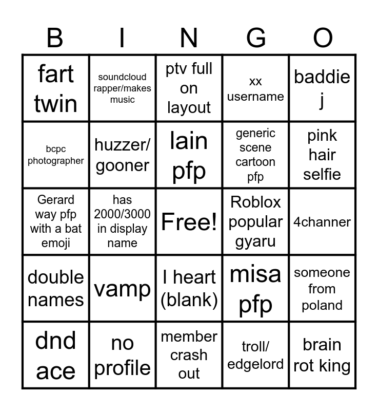 This bingo card has a free space and 24 words: vamp, no profile, lain pfp, dnd ace, baddie j, fart twin, bcpc photographer, soundcloud rapper/makes music, Roblox popular gyaru, I heart (blank), generic scene cartoon pfp, Gerard way pfp with a bat emoji, misa pfp, someone from poland, huzzer/ gooner, troll/ edgelord, 4channer, ptv full on layout, pink hair selfie, has 2000/3000 in display name, brain rot king, double names, xx username and member crash out.