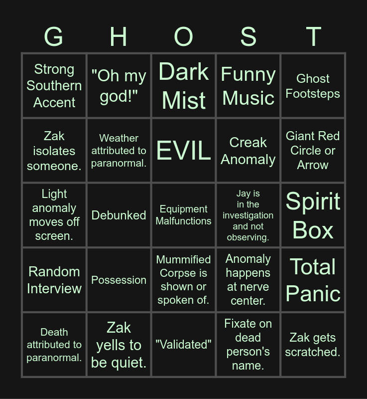 This bingo card has 125 words: Zak provokes spirit., Sexual Joke, Zak sexually harasses the ghost., Evidence not caught on camera., Yelling over device., Stick figure stands on person., Random Interview, Interviewed person was a non believer, Fixate on dead person's name., Bad Reenactment, Zak talks about himself for a long time., Zak opens a portal., Attic or Basement, Angry Spirit, Instrument Spike, Zak interrupts someone., Zak yells to be quiet., Police show up., Abrupt Ending, Ghost threatens someone., Zak gets scratched., Light anomaly moves off screen., Aaron is sent alone., Light anomaly enters someone., Definitely not an actor., EVIL, Funny Music, Crew bothers a shop., "This is serious.", Cold Air, Total Panic, Scared by Animal, Debunked, Possession, Someone lays down., Ghost says its name., Pushed down stairs., "Feeding off emotion.", Dark Energy, Already a portal., Strong Southern Accent, Visits Grave, Child Ghost, "Did you see/hear/feel that?", Chest Pain, "What is that?", Door Slam, Ghost Footsteps, "Compelling", Ghost throws stuff., No evidence until leaving., Something happens off location., Violent Attack, No reason given for haunting., Zak gets poetic., Crew jumps to a conclusion., Cold, "Dude" or "Bro", Billy or Jay never leave Nerve Center., Jay is in the investigation and not observing., Zak isolates someone., Science Lesson, History Lesson, New Tech, Someone becomes aggressive., "Look at how dark it is.", Chills, Mummified Corpse is shown or spoken of., Rapid Bleeps, Spirit Box, Spirit Puck, Ghost involves Mirrors, Someone gets sent alone and never does anything., Stick Figure crawling., Billy is in the investigation and not observing., Repeats audio 3 or more times., "We left to help them.", Polaroid Picture, Ghost Knocks, Close up of shocked Aaron., Walkie Talkies are used., Someone eats something., Zak touches something he's not supposed to., Death attributed to paranormal., Weather attributed to paranormal., Crew other than the main cast is either mentioned or shown., Running Away, Dizzy, Actual Historian Appears, "I was once a skeptic.", Unexplained Screaming, Hospital, Morgue or Prison, Someone sent alone outside., Zak gets emotional., Dark Mist, "Validated", Disrespect to the dead., Interviewee's trauma is mostly glossed over or ignored., Ghost Touch, Equipment Malfunctions, The spirit is given rules., Anomaly happens at nerve center., "Woah!", "Do that again.", Graffiti, Ghost talks through text., SHADOW FIGURE, Giant Red Circle or Arrow, Anomaly enters or leaves equipment., Battery Drains, Spirit only has nickname., Dilapidated Building, Respirators needed by whole crew., Evidence only caught in post-production., Demonic Entities, "Be careful.", "This is dangerous.", Beg spirit to talk., Flashing Lights, Creak Anomaly, Anomaly happens on a different floor., "I am alone.", Spirit says nonsense., "Oh my god!" and "Intense energy.".