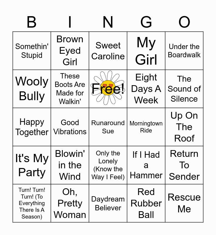 This bingo card has 1 images and 76 words: Twist And Shout, I'm a Believer, Sweet Caroline, Do Wah Diddy Diddy, Build Me Up Buttercup, Surfin' U.S.A., You Can't Hurry Love, Sherry, I Got You Babe, Can't Take My Eyes off You, Rescue Me, Chapel of Love, Free!, Wooly Bully, Sugar Sugar, Good Vibrations, Let's Twist Again, Runaround Sue, Fun, Fun, Fun, Under the Boardwalk, Be My Baby, Happy Together, These Boots Are Made for Walkin', Brown Eyed Girl, My Girl, California Dreamin', Stand By Me, Ferry Cross the Mersey, Respect, Then He Kissed Me, It's Not Unusual, Ob-La-Di, Ob-La-Da, Love Me Do, If I Had a Hammer, The Sound of Silence, Eight Days A Week, I Only Want To Be With You, Mr. Tambourine Man, Up On The Roof, Red Rubber Ball, You Really Got Me, Baby Love, I Heard It Through The Grapevine, Unchained Melody, When a Man Loves a Woman, Yesterday, Turn! Turn! Turn! (To Everything There Is A Season), Somethin' Stupid, Leaving on a Jet Plane, The End of the World, Will You Love Me Tomorrow, Only the Lonely (Know the Way I Feel), Anyone Who Had a Heart, Suspicious Minds, Crying, Georgia on My Mind, I Got You (I Feel Good), Wild Thing, Bring It On Home to Me, (Sittin' On) the Dock of the Bay, Blowin' in the Wind, Da Doo Ron Ron, Downtown, House Of The Rising Sun, Sadie (The Cleaning Lady), Georgy Girl, Morningtown Ride, She's so Fine, Friday On My Mind, Hit The Road Jack, Return To Sender, It's My Party, Oh, Pretty Woman, (I Can't Get No) Satisfaction, Daydream Believer and You Don't Own Me.