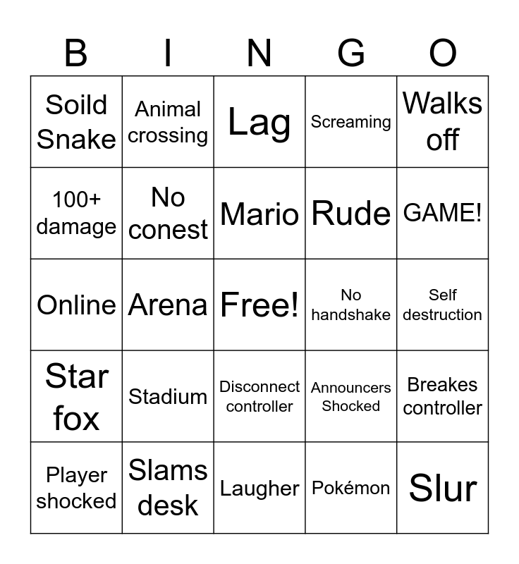 This bingo card has a free space and 24 words: Stadium, Slams desk, Mario, Player shocked, Walks off, Soild Snake, 100+ damage, Animal crossing, No handshake, Disconnect controller, Rude, Online, Announcers Shocked, Breakes controller, No conest, Pokémon, Self destruction, Lag, GAME!, Arena, Slur, Star fox, Screaming and Laugher.