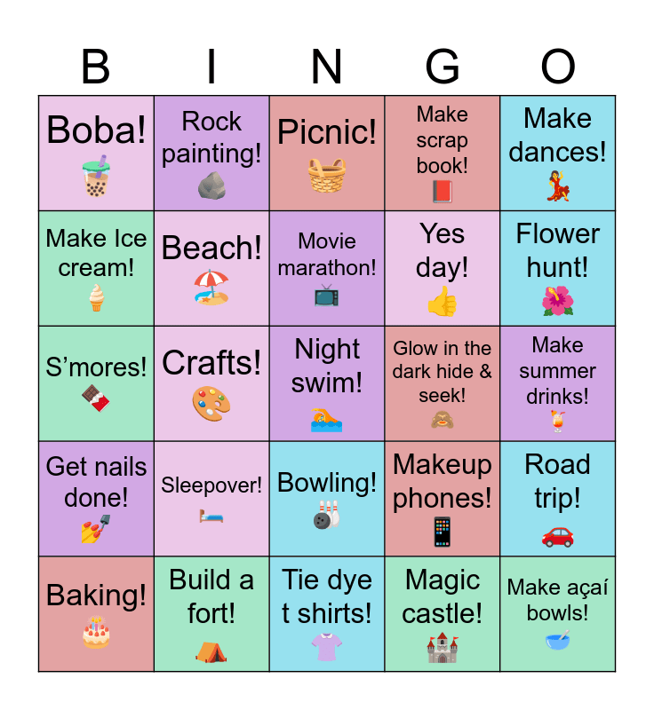 This bingo card has a free space and 24 words: Sleepover! ποΈ, Build a fort! βΊοΈ, Movie marathon! πΊ, Baking! π, Make dances! π, Boba! π§, Make Ice cream! π¦, Rock painting! πͺ¨, Glow in the dark hide & seek! π, Bowling! π³, Yes day! π, Sβmores! π«, Makeup phones! π±, Road trip! π, Beach! ποΈ, Magic castle! π°, Make summer drinks! πΉ, Picnic! π§Ί, Flower hunt! πΊ, Crafts! π¨, Make aΓ§aΓ bowls! π₯£, Get nails done! π , Make scrap book! π and Tie dye t shirts! π.
