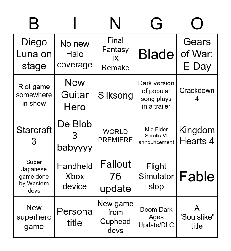 This bingo card has a free space and 24 words: Handheld Xbox device, Persona title, Silksong, New superhero game, Gears of War: E-Day, Diego Luna on stage, Riot game somewhere in show, No new Halo coverage, Mid Elder Scrolls VI announcement, Fallout 76 update, Dark version of popular song plays in a trailer, Starcraft 3, Flight Simulator slop, Fable, New Guitar Hero, Doom Dark Ages Update/DLC, Kingdom Hearts 4, Final Fantasy IX Remake, Crackdown 4, De Blob 3 babyyyy, A "Soulslike" title, Super Japanese game done by Western devs, Blade and New game from Cuphead devs.