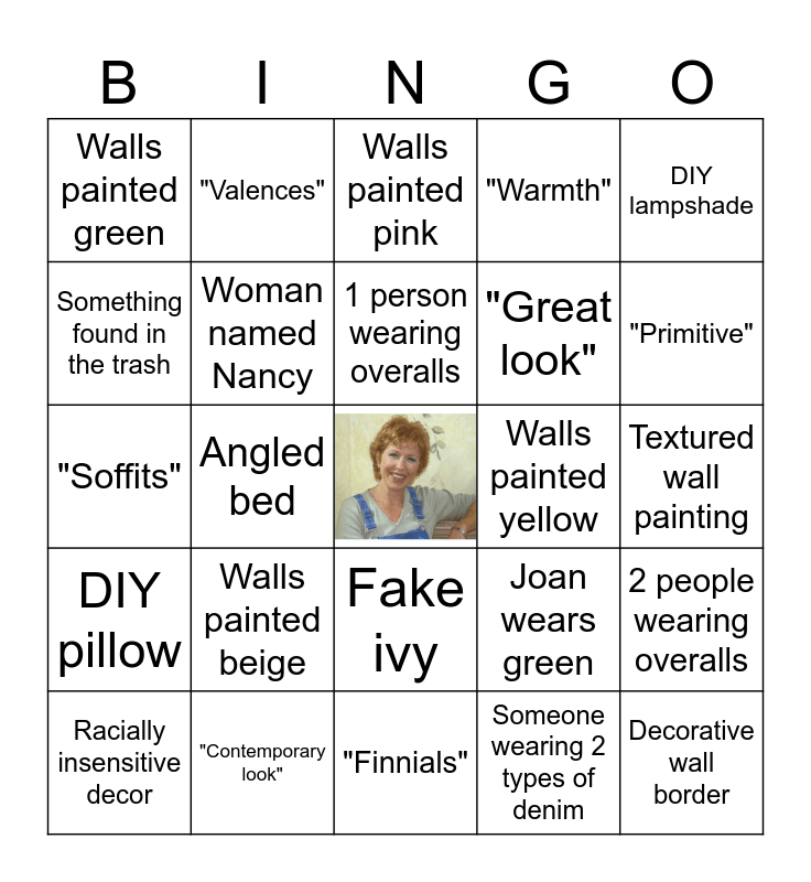 This bingo card has a free space and 24 words: Racially insensitive decor, Walls painted beige, 1 person wearing overalls, Someone wearing 2 types of denim, DIY lampshade, Walls painted green, "Valences", Walls painted pink, Walls painted yellow, Textured wall painting, "Soffits", Woman named Nancy, Joan wears green, 2 people wearing overalls, Something found in the trash, "Contemporary look", "Finnials", "Warmth", "Primitive", DIY pillow, Angled bed, Fake ivy, "Great look" and Decorative wall border.