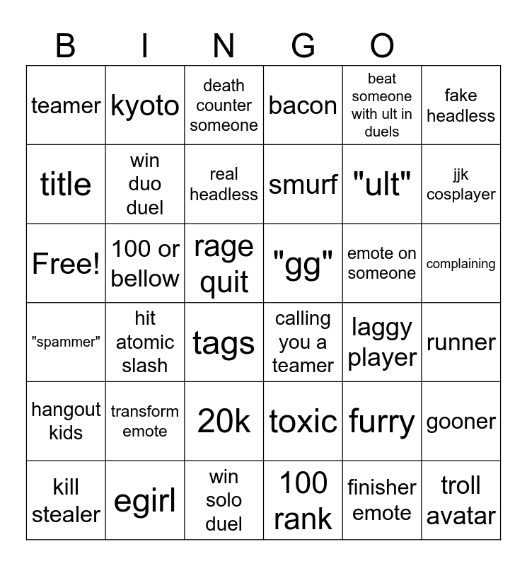 This bingo card has 36 words: toxic, 20k, 100 rank, title, "spammer", "gg", win duo duel, win solo duel, beat someone with ult in duels, furry, jjk cosplayer, bacon, gooner, 100 or bellow, smurf, teamer, hangout kids, emote on someone, Free!, death counter someone, rage quit, hit atomic slash, calling you a teamer, tags, laggy player, kyoto, "ult", egirl, real headless, fake headless, troll avatar, kill stealer, runner, complaining, transform emote and finisher emote.