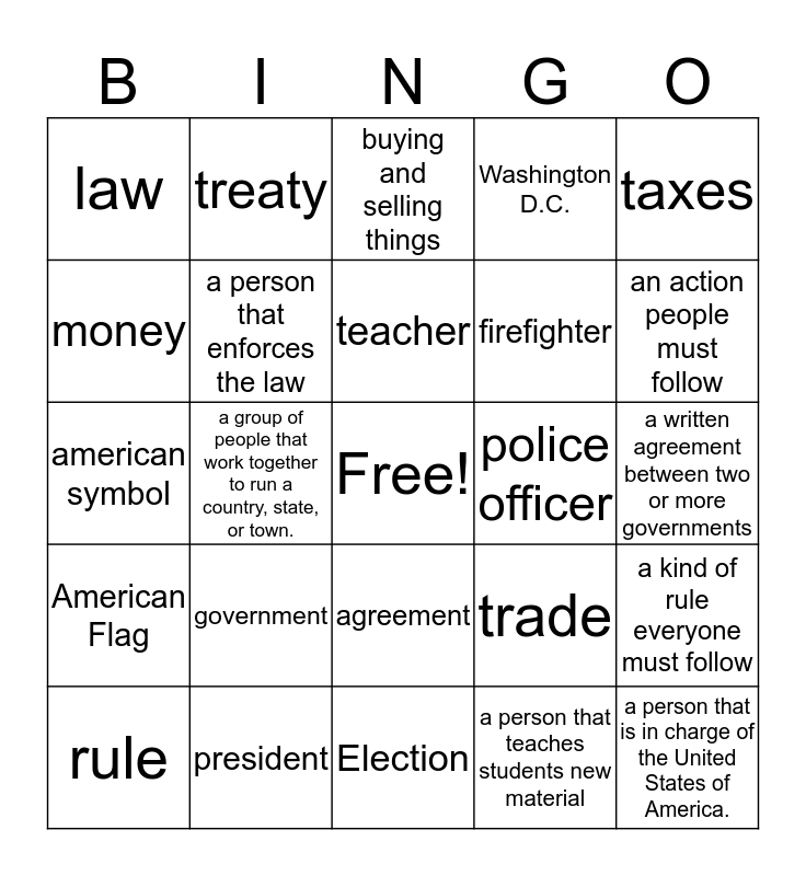 This bingo card has a free space and 24 words: government, president, teacher, rule, taxes, law, money, treaty, police officer, agreement, firefighter, american symbol, trade, a kind of rule everyone must follow, a person that enforces the law, a person that teaches students new material, a written agreement between two or more governments, buying and selling things, an action people must follow, a group of people that work together to run a country, state, or town., a person that is in charge of the United States of America., American Flag, Washington D.C. and Election.