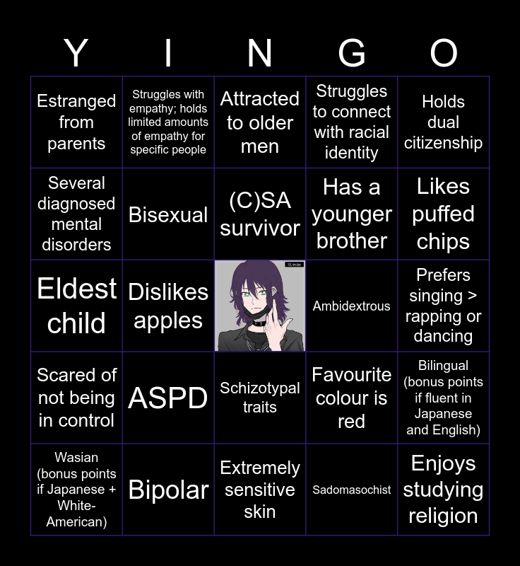 This bingo card has a free space and 24 words: ASPD, Bipolar, (C)SA survivor, Wasian (bonus points if Japanese + White-American), Holds dual citizenship, Estranged from parents, Several diagnosed mental disorders, Struggles with empathy; holds limited amounts of empathy for specific people, Ambidextrous, Schizotypal traits, Has a younger brother, Eldest child, Favourite colour is red, Bilingual (bonus points if fluent in Japanese and English), Bisexual, Sadomasochist, Prefers singing > rapping or dancing, Attracted to older men, Likes puffed chips, Dislikes apples, Enjoys studying religion, Scared of not being in control, Struggles to connect with racial identity and Extremely sensitive skin.