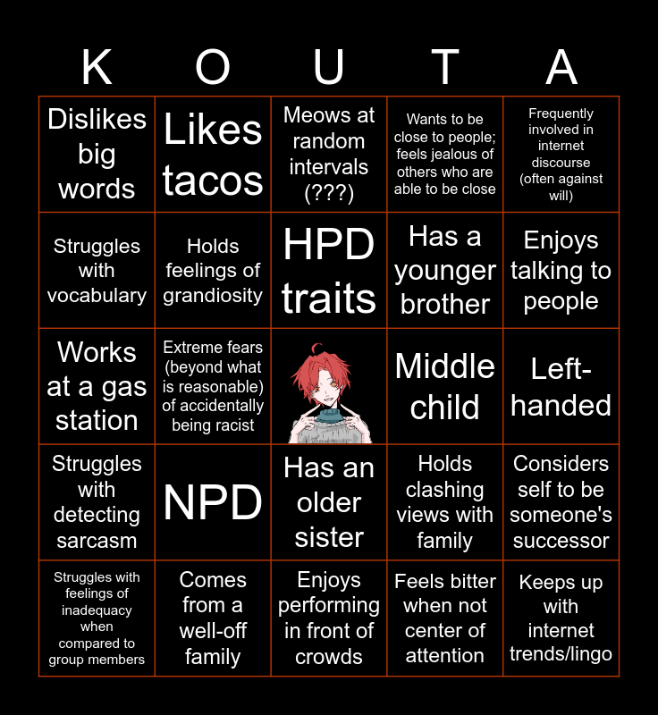 This bingo card has a free space and 24 words: NPD, Comes from a well-off family, HPD traits, Struggles with feelings of inadequacy when compared to group members, Frequently involved in internet discourse (often against will), Dislikes big words, Struggles with vocabulary, Likes tacos, Middle child, Has an older sister, Has a younger brother, Works at a gas station, Holds clashing views with family, Considers self to be someone's successor, Holds feelings of grandiosity, Feels bitter when not center of attention, Left-handed, Meows at random intervals (???), Enjoys talking to people, Extreme fears (beyond what is reasonable) of accidentally being racist, Keeps up with internet trends/lingo, Struggles with detecting sarcasm, Wants to be close to people; feels jealous of others who are able to be close and Enjoys performing in front of crowds.