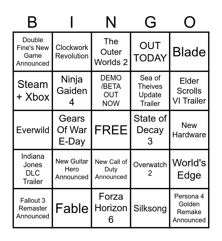 This bingo card has a free space and 29 words: Fallout 3 Remaster Announced, Tony Hawk New Game or Remaster Announced, Gears Of War E-Day, New Halo, Double Fine's New Game Announced, The Outer Worlds 2, Ninja Gaiden 4, New Guitar Hero Announced, State of Decay 3, Fable, New Hardware, Persona 4 Golden Remake Announced, Forza Horizon 6, Silksong, Elder Scrolls VI Trailer, Final Fantasy XVI Trailer, New Call of Duty Announced, Indiana Jones DLC Trailer, Blade, Everwild, Overwatch 2, Perfect Dark Trailer, Sea of Theives Update Trailer, Steam + Xbox, OUT TODAY, Clockwork Revolution, World's Edge, DEMO /BETA OUT NOW and Splinter Cell.