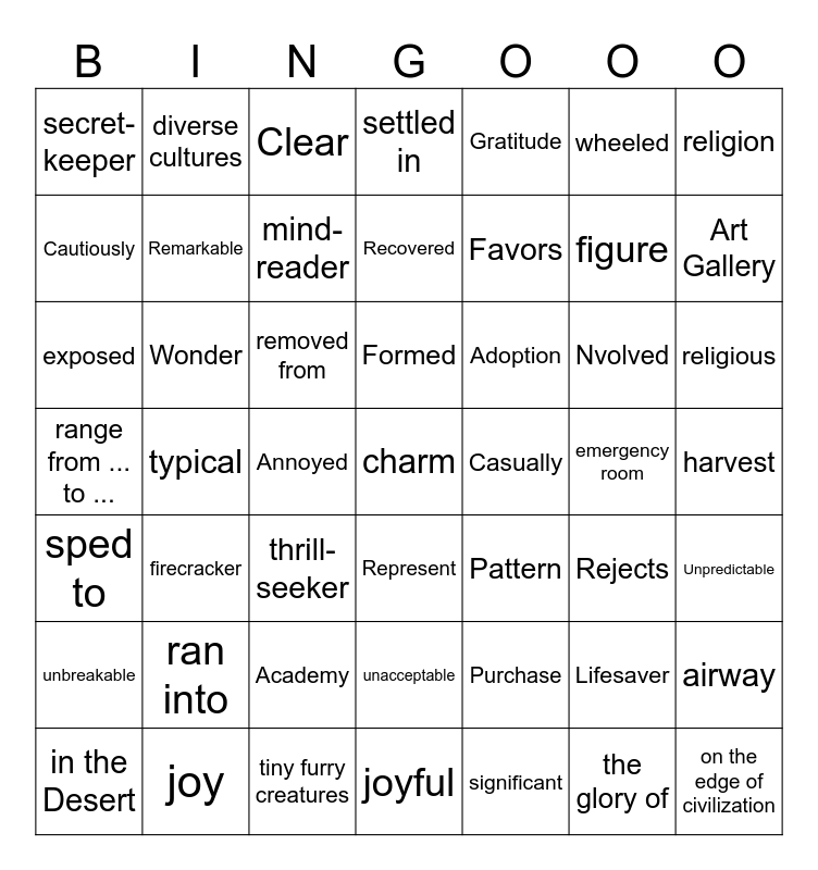 This bingo card has 88 words: an animal shelter, tiny furry creatures, Formed, shoo him away, adopt, grabbed a blanket, airway, emergency room, Lifesaver, observed, surrounded, disturbed, Nvolved, exposed, Seated, Cautiously, Casually, Pattern, unstable, unbreakable, unacceptable, Unpredictable, Recovered, Persisted, Annoyed, Panicked, Frustrated, Puzzled, Defend, Narrow, Clear, settled in, ran into, sped to, removed from, wheeled, secret-keeper, bread-winner, thrill-seeker, mind-reader, Favors, Rejects, Purchase, Adoption, Art Gallery, in the Desert, resident scholar, Academy, The wealth of heritage, Remarkable, on the edge of civilization, Represent, the glory of, cultural interaction, it is no accident, Greek elements., Wonder, diverse cultures, a single space, Odd, pointed out, obvious clue, Tolerance, embraced, ceremony, range from ... to ..., origin, religion, religious, figure, charm, joy, joyful, Gratitude, feature, Decorate, significant, fade away, typical, firecracker, evil, in spite of, Commercial, take advantage of, the media, reflect, harvest and agricultural.