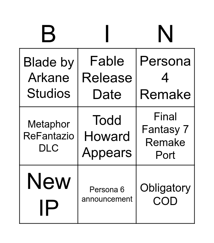 This bingo card has a free space and 8 words: Final Fantasy 7 Remake Port, Persona 4 Remake, Fable Release Date, New IP, Blade by Arkane Studios, Obligatory COD, Metaphor ReFantazio DLC and Persona 6 announcement.
