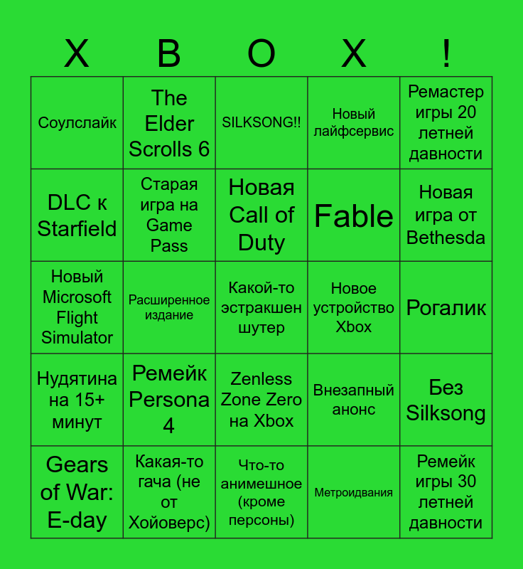 This bingo card has 25 words: Ремейк Persona 4, Что-то анимешное (кроме персоны), Новая Call of Duty, Gears of War: E-day, Ремастер игры 20 летней давности, Соулслайк, DLC к Starfield, The Elder Scrolls 6, Новое устройство Xbox, Zenless Zone Zero на Xbox, Fable, Новый Microsoft Flight Simulator, Внезапный анонс, Без Silksong, Старая игра на Game Pass, Ремейк игры 30 летней давности, Рогалик, SILKSONG!!, Новая игра от Bethesda, Расширенное издание, Какой-то эстракшен шутер, Какая-то гача (не от Хойоверс), Нудятина на 15+ минут, Новый лайфсервис and Метроидвания.
