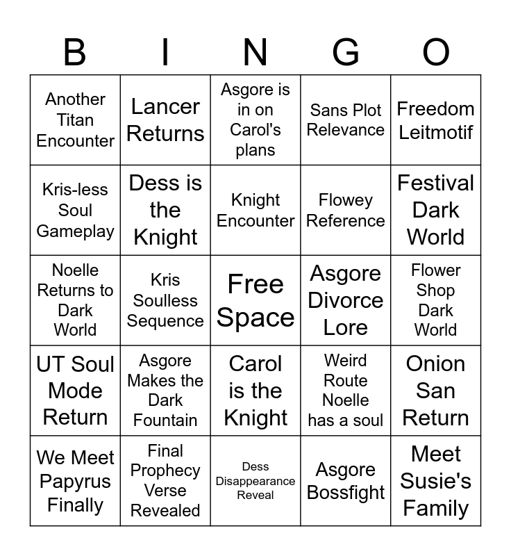This bingo card has a free space and 24 words: Asgore Makes the Dark Fountain, Final Prophecy Verse Revealed, Knight Encounter, We Meet Papyrus Finally, Freedom Leitmotif, Another Titan Encounter, Kris-less Soul Gameplay, Lancer Returns, Asgore Divorce Lore, Carol is the Knight, Flowey Reference, Noelle Returns to Dark World, Weird Route Noelle has a soul, Onion San Return, Dess is the Knight, Asgore Bossfight, Flower Shop Dark World, Asgore is in on Carol's plans, Festival Dark World, Kris Soulless Sequence, Meet Susie's Family, UT Soul Mode Return, Sans Plot Relevance and Dess Disappearance Reveal.