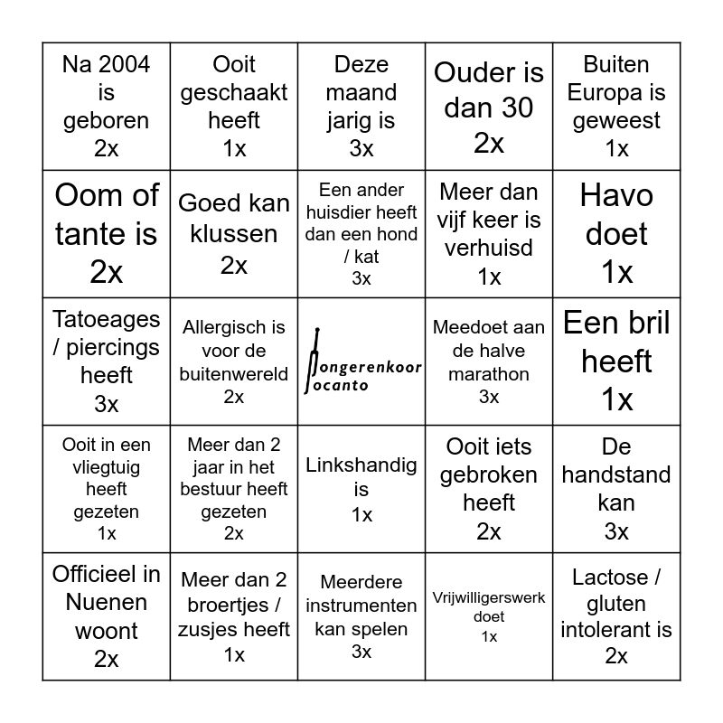 This bingo card has a free space and 24 words: Meer dan 2 jaar in het bestuur heeft gezeten 2x, Meer dan 2 broertjes / zusjes heeft 1x, Een ander huisdier heeft dan een hond / kat 3x, Officieel in Nuenen woont 2x, Buiten Europa is geweest 1x, Na 2004 is geboren 2x, Oom of tante is 2x, Ooit geschaakt heeft 1x, Meedoet aan de halve marathon 3x, Linkshandig is 1x, Meer dan vijf keer is verhuisd 1x, Tatoeages / piercings heeft 3x, Ooit iets gebroken heeft 2x, De handstand kan 3x, Goed kan klussen 2x, Vrijwilligerswerk doet 1x, Een bril heeft 1x, Deze maand jarig is 3x, Havo doet 1x, Allergisch is voor de buitenwereld 2x, Lactose / gluten intolerant is 2x, Ooit in een vliegtuig heeft gezeten 1x, Ouder is dan 30 2x and Meerdere instrumenten kan spelen 3x.