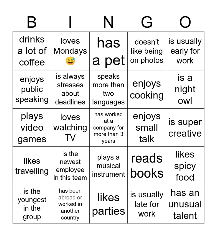 This bingo card has a free space and 24 words: is the newest employee in this team, has been abroad or worked in another country, speaks more than two languages, is the youngest in the group, is usually early for work, drinks a lot of coffee, enjoys public speaking, loves Mondays 😅, enjoys small talk, plays a musical instrument, enjoys cooking, plays video games, reads books, likes spicy food, is always stresses about deadlines, is usually late for work, is super creative, has a pet, is a night owl, loves watching TV, has an unusual talent, likes travelling, doesn't like being on photos and likes parties.