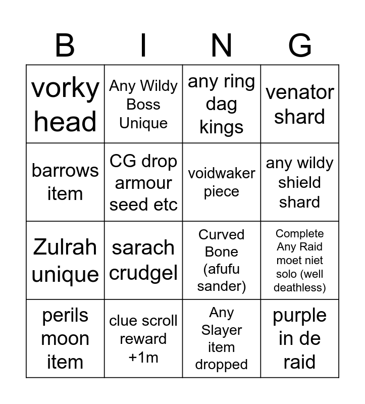 This bingo card has 16 words: clue scroll reward +1m, Complete Any Raid moet niet solo (well deathless), any ring dag kings, vorky head, Zulrah unique, Any Wildy Boss Unique, Curved Bone (afufu sander), Any Slayer item dropped, barrows item, CG drop armour seed etc, perils moon item, venator shard, sarach crudgel, any wildy shield shard, voidwaker piece and purple in de raid.