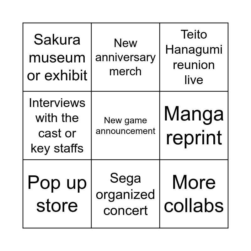 This bingo card has a free space and 8 words: Manga reprint, Teito Hanagumi reunion live, New anniversary merch, Pop up store, Sakura museum or exhibit, More collabs, Interviews with the cast or key staffs and Sega organized concert.