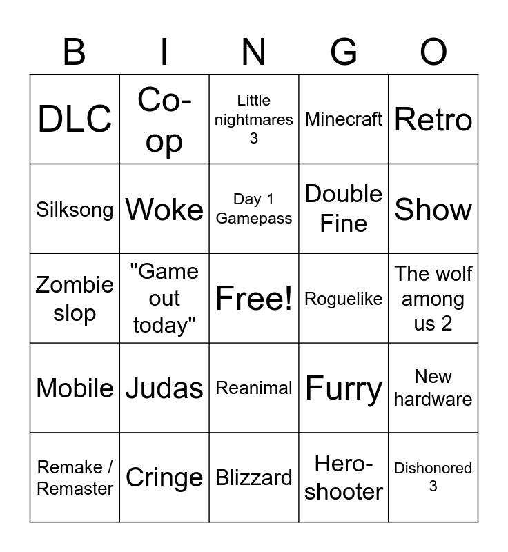 This bingo card has a free space and 24 words: Judas, Cringe, Day 1 Gamepass, Remake / Remaster, Retro, DLC, Silksong, Co-op, Roguelike, Reanimal, Double Fine, Zombie slop, Furry, New hardware, Woke, Hero-shooter, The wolf among us 2, Little nightmares 3, Show, "Game out today", Dishonored 3, Mobile, Minecraft and Blizzard.