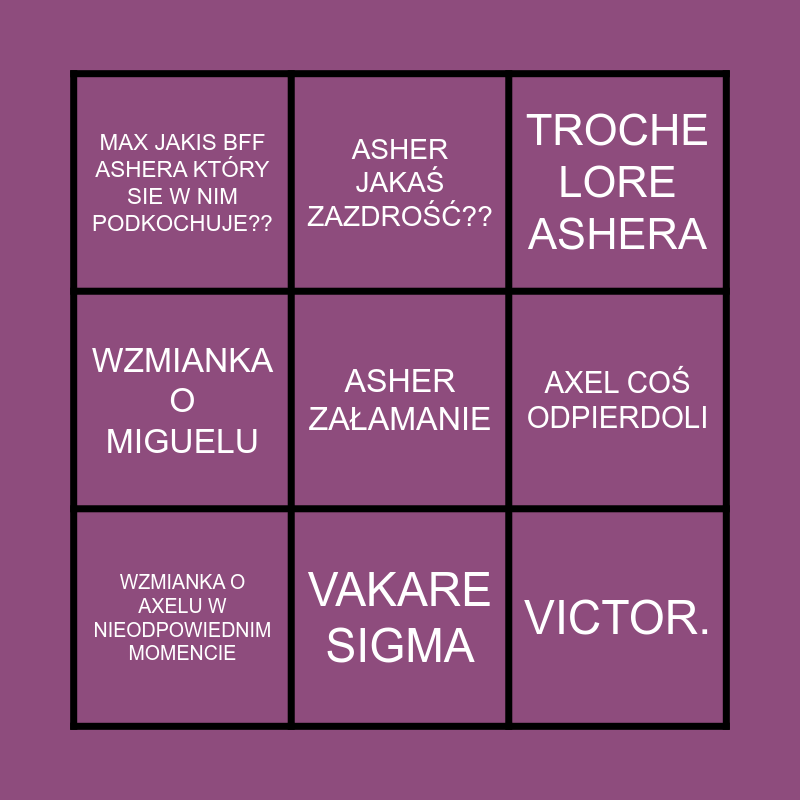 This bingo card has a free space and 8 words: AXEL COŚ ODPIERDOLI, TROCHE LORE ASHERA, ASHER JAKAŚ ZAZDROŚĆ??, WZMIANKA O AXELU W NIEODPOWIEDNIM MOMENCIE, MAX JAKIS BFF ASHERA KTÓRY SIE W NIM PODKOCHUJE??, VICTOR., WZMIANKA O MIGUELU and VAKARE SIGMA.