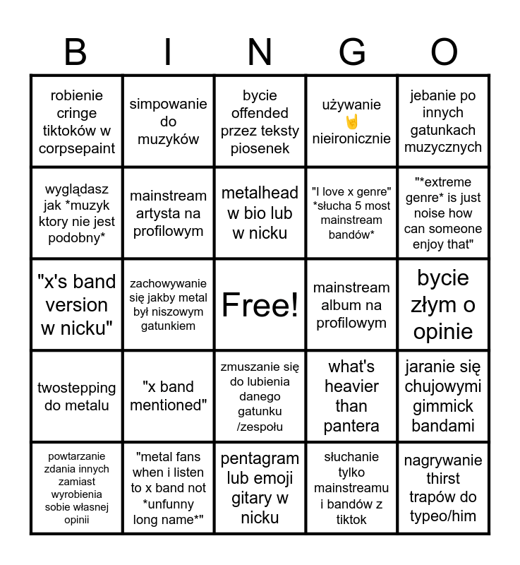 This bingo card has a free space and 24 words: "x band mentioned", "metal fans when i listen to x band not *unfunny long name*", metalhead w bio lub w nicku, powtarzanie zdania innych zamiast wyrobienia sobie własnej opinii, jebanie po innych gatunkach muzycznych, robienie cringe tiktoków w corpsepaint, wyglądasz jak *muzyk ktory nie jest podobny*, simpowanie do muzyków, mainstream album na profilowym, zmuszanie się do lubienia danego gatunku /zespołu, "I love x genre" *słucha 5 most mainstream bandów*, "x's band version w nicku", what's heavier than pantera, jaranie się chujowymi gimmick bandami, mainstream artysta na profilowym, słuchanie tylko mainstreamu i bandów z tiktok, bycie złym o opinie, bycie offended przez teksty piosenek, "*extreme genre* is just noise how can someone enjoy that", zachowywanie się jakby metal był niszowym gatunkiem, nagrywanie thirst trapów do typeo/him, twostepping do metalu, używanie 🤘 nieironicznie and pentagram lub emoji gitary w nicku.