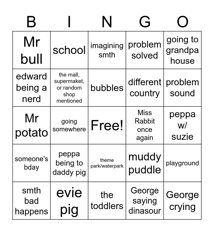 This bingo card has a free space and 24 words: peppa being to daddy pig, evie pig, bubbles, smth bad happens, going to grandpa house, Mr bull, edward being a nerd, school, Miss Rabbit once again, theme park/waterpark, different country, Mr potato, muddy puddle, playground, the mall, supermaket, or random shop mentioned, George saying dinasour, peppa w/ suzie, imagining smth, problem sound, going somewhere, George crying, someone's bday, problem solved and the toddlers.