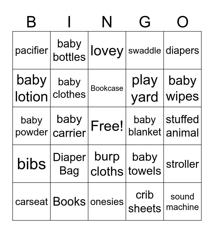 This bingo card has a free space and 24 words: Diaper Bag, Books, Bookcase, carseat, diapers, pacifier, baby lotion, baby bottles, baby blanket, burp cloths, play yard, baby powder, baby towels, stroller, baby clothes, crib sheets, stuffed animal, lovey, baby wipes, baby carrier, sound machine, bibs, swaddle and onesies.