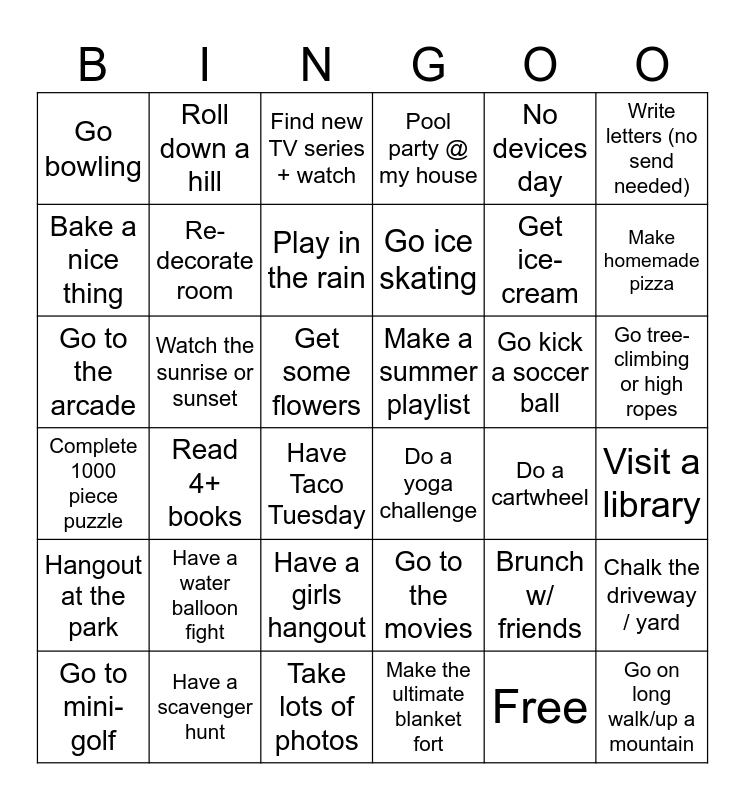 This bingo card has 36 words: Go to the movies, Have a girls hangout, Make the ultimate blanket fort, Bake a nice thing, Complete 1000 piece puzzle, Make a summer playlist, Re-decorate room, Take lots of photos, No devices day, Brunch w/ friends, Make homemade pizza, Pool party @ my house, Chalk the driveway / yard, Watch the sunrise or sunset, Go ice skating, Go bowling, Hangout at the park, Go kick a soccer ball, Go to the arcade, Find new TV series + watch, Get some flowers, Read 4+ books, Do a yoga challenge, Have Taco Tuesday, Do a cartwheel, Roll down a hill, Get ice-cream, Have a scavenger hunt, Play in the rain, Write letters (no send needed), Go on long walk/up a mountain, Go to mini-golf, Visit a library, Go tree-climbing or high ropes, Have a water balloon fight and Free.
