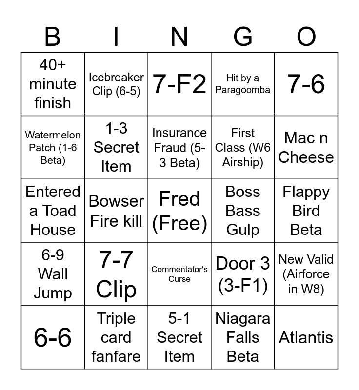 This bingo card has a free space and 43 words: "Nobody wants to win!", Atlantis, Alcatraz (7-5), 6-6, 5-9, Niagara Falls Beta, 7-F2, 7-1, 7-6, Triple card fanfare, Hit by a Paragoomba, Boss Bass Gulp, Commentator's Curse, 7-7 Clip, Equipped a Frog Suit, 5-1 Secret Item, Boom Boom Star Kill (BRO!), Entered a Toad House, Tail Clip, Mac n Cheese, Icebreaker Clip (6-5), 4+ Final Screen Obstacles, Command?, 40+ minute finish, Sub-30 Finish, Flappy Bird Beta, Defeated W3 island Bro, Defeated W7 island Bro, Door 3 (3-F1), 6-9 Wall Jump, Old Valid (3-F2 in W8), New Valid (Airforce in W8), Bowser Hammer kill, Bowser Fire kill, Bowser stomp kill, Entered Statue room, W5 Tower required, Insurance Fraud (5-3 Beta), Watermelon Patch (1-6 Beta), First Class (W6 Airship), Questionable Hitbox, 1-3 Secret Item and 3-7 Secret Item.