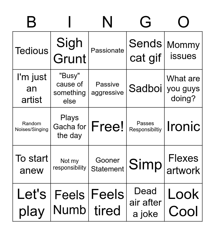 This bingo card has a free space and 24 words: Not my responsibility, Feels Numb, Passive aggressive, Let's play, Mommy issues, Tedious, I'm just an artist, Sigh Grunt, Passes Responsibiltiy, Gooner Statement, Sadboi, Random Noises/Singing, Simp, Flexes artwork, "Busy" cause of something else, Dead air after a joke, Ironic, Passionate, What are you guys doing?, Plays Gacha for the day, Look Cool, To start anew, Sends cat gif and Feels tired.