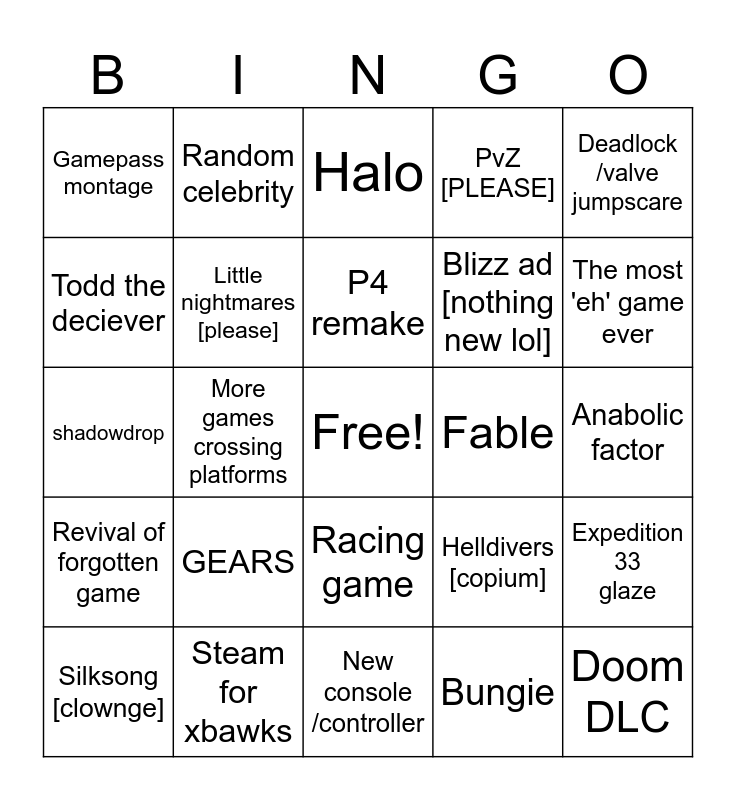 This bingo card has a free space and 24 words: GEARS, Steam for xbawks, P4 remake, Silksong [clownge], Deadlock /valve jumpscare, Gamepass montage, Todd the deciever, Random celebrity, Fable, Racing game, Blizz ad [nothing new lol], shadowdrop, Helldivers [copium], Expedition 33 glaze, Little nightmares [please], Bungie, Anabolic factor, Halo, The most 'eh' game ever, More games crossing platforms, Doom DLC, Revival of forgotten game, PvZ [PLEASE] and New console /controller.