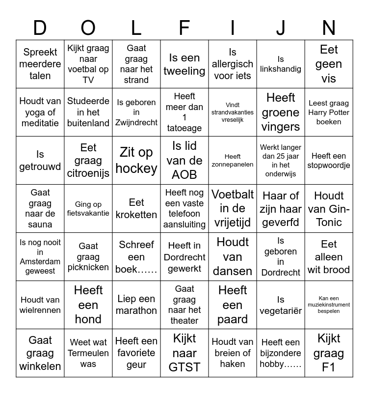 This bingo card has 61 words: Gaat graag naar IKEA, Gaat graag naar de sauna, Eet graag chocolade, Eet graag citroenijs, Eet kroketten, Is vegetariër, Eet geen vis, Heeft een huisdier, Studeerde in het buitenland, Kan een muziekinstrument bespelen, Is een tweeling, Liep een marathon, Is linkshandig, Schreef een boek……, Heeft een bijzondere hobby……, Spreekt meerdere talen, Heeft groene vingers, Is allergisch voor iets, Startte een eigen bedrijf, Houdt van yoga of meditatie, Leest graag Harry Potter boeken, Gaat graag naar het strand, Heeft een stopwoordje, Werkt langer dan 25 jaar in het onderwijs, Werkt korter dan 5 jaar in het onderwijs, Heeft in Dordrecht gewerkt, Is nog nooit in Amsterdam geweest, Is geboren in Rotterdam, Is geboren in Zwijndrecht, Is geboren in Dordrecht, Heeft een kat, Heeft een hond, Houdt van breien of haken, Kijkt graag F1, Kijkt graag naar voetbal op TV, Voetbalt in de vrijetijd, Gaat graag naar het theater, Vindt strandvakanties vreselijk, Houdt van dansen, Heeft meer dan 1 tatoeage, Heeft een paard, Zit op hockey, Is getrouwd, Draagt lenzen, Heeft zonnepanelen, Houdt van Gin-Tonic, Gaat graag winkelen, Heeft een favoriete geur, Kijkt naar GTST, Is lid van de AOB, Ging op fietsvakantie, Surft bij goed surfweer, Houdt van wielrennen, Haar of zijn haar geverfd, Een cosmetische ingreep laten doen, Gaat graag picknicken, Eet alleen wit brood, Weet wat Termeulen was, Is geboren in de Hoeksche Waard, Heeft nog een vaste telefoon aansluiting and Houdt van spelletjes avonden.