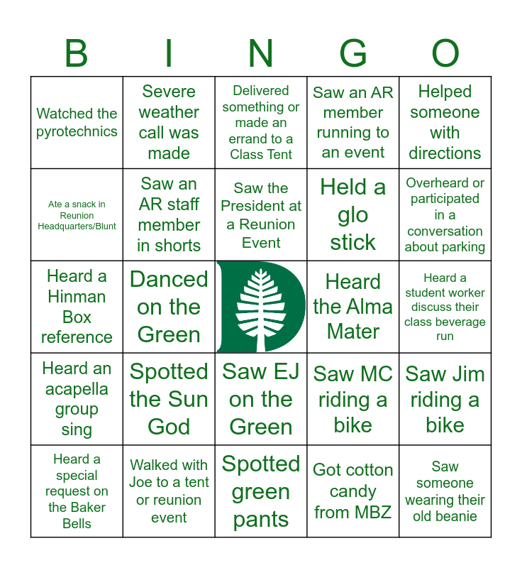 This bingo card has a free space and 50 words: Question was asked about the golf course, Saw someone wearing their old beanie, Saw an old varsity jacket, Spotted green pants, Spotted the Sun God, Rain locations were used, Severe weather call was made, Tended Bar in some aspect at a class tent, Ate a snack in Reunion Headquarters/Blunt, Talked with a student worker, Saw an AR staff member in shorts, Saw an AR member running to an event, Saw Jim riding a bike, Saw MC riding a bike, Wore Dartmouth swag, Heard an ice conversation, Saw the President at a Reunion Event, Heard the Alma Mater, Spotted a non-Advancement SLT member, Helped someone with directions, Danced on the Green, Got cotton candy from MBZ, Watched the pyrotechnics, Held a glo stick, Saw Cheryl in Reunion Headquarters or the lobby of Blunt, Heard Cheryl refer to the Class of 1982 building, Overheard or participated in a conversation about parking, Was asked a question by Carolyn or asked Carolyn a question, Delivered something or made an errand to a Class Tent, Saw EJ on the Green, Heard someone say the dorms looked like they did when they were a student, Heard someone mispronounce President Beilock, Heard either Randy or Ellen say “workbook”, Saw Cameron talking with a student worker, Walked with Joe to a tent or reunion event, Touched an inflatable, Played one of the lawn games, Had an ice cream on the Green, Danced to “Don’t Stop Believin” on the Green, Heard a student worker discuss their class beverage run, Heard "EBAs", Someone mentions having breakfast at Lou’s, Someone mentions a Woccum, Someone asks to see a yearbook in Blunt, Heard a special request on the Baker Bells, Heard a Hinman Box reference, Attended a Back to Class session, Went to the BEMA, Heard an acapella group sing and Saw Jake handing out a name badge.
