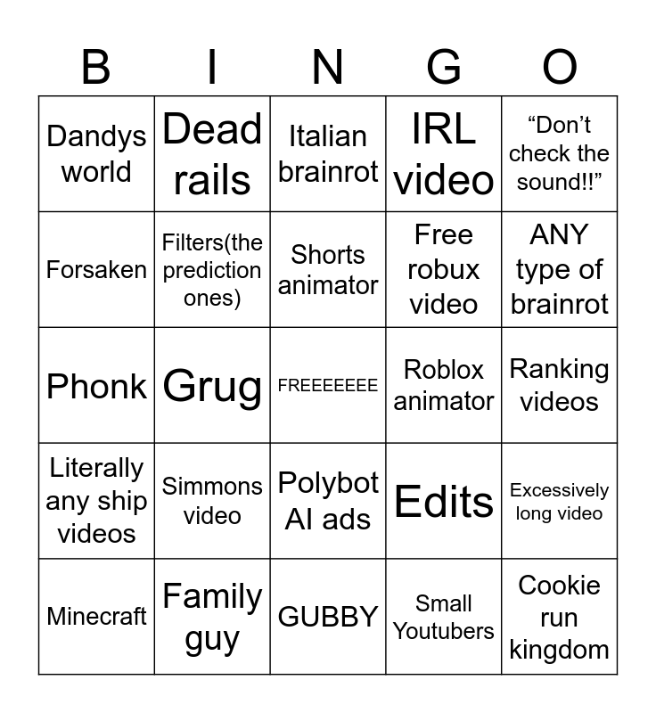 This bingo card has a free space and 24 words: Simmons video, Family guy, Shorts animator, Minecraft, “Don’t check the sound!!”, Dandys world, Forsaken, Dead rails, Roblox animator, Polybot AI ads, Free robux video, Phonk, Edits, Excessively long video, Filters(the prediction ones), Small Youtubers, Ranking videos, Italian brainrot, ANY type of brainrot, Grug, Cookie run kingdom, Literally any ship videos, IRL video and GUBBY.