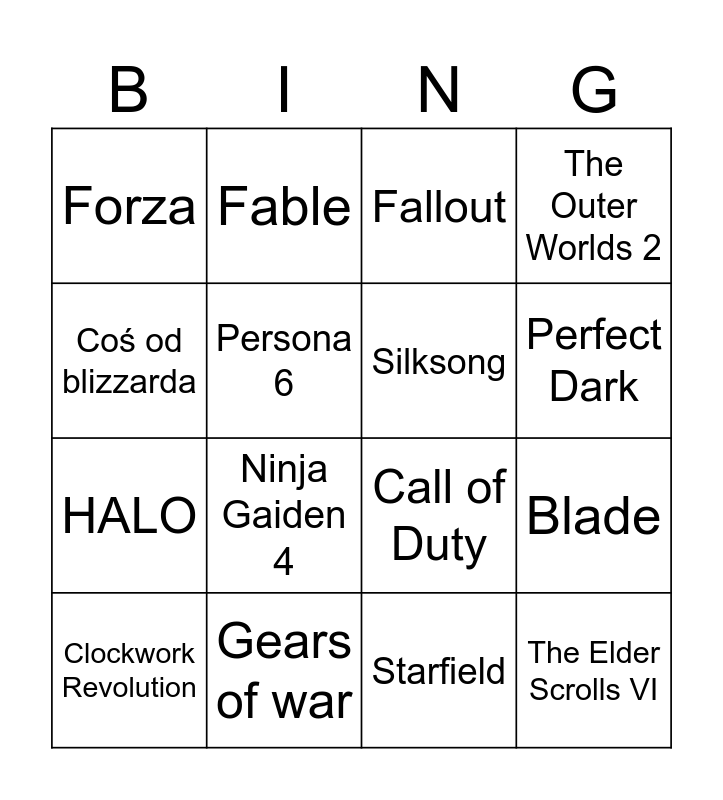 This bingo card has 16 words: Gears of war, Blade, Fallout, Forza, HALO, Fable, Call of Duty, Starfield, Coś od blizzarda, Persona 6, Clockwork Revolution, The Outer Worlds 2, Ninja Gaiden 4, Perfect Dark, Silksong and The Elder Scrolls VI.