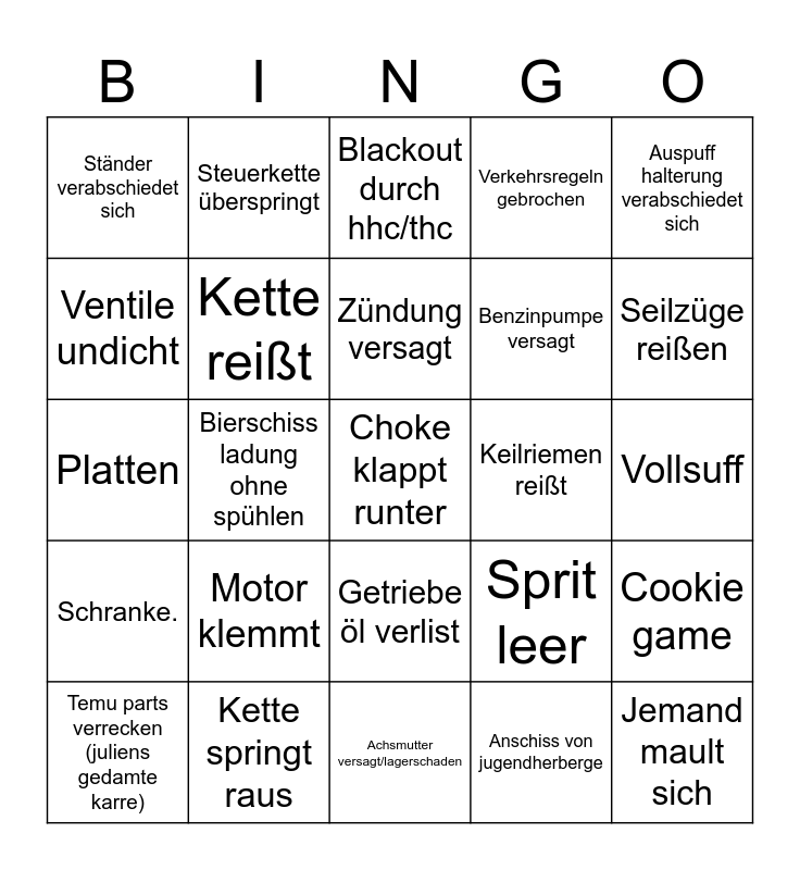 This bingo card has a free space and 24 words: Motor klemmt, Kette springt raus, Zündung versagt, Temu parts verrecken (juliens gedamte karre), Auspuff halterung verabschiedet sich, Ständer verabschiedet sich, Ventile undicht, Steuerkette überspringt, Keilriemen reißt, Getriebe öl verlist, Benzinpumpe versagt, Platten, Sprit leer, Cookie game, Kette reißt, Anschiss von jugendherberge, Vollsuff, Blackout durch hhc/thc, Seilzüge reißen, Bierschiss ladung ohne spühlen, Jemand mault sich, Schranke., Verkehrsregeln gebrochen and Achsmutter versagt/lagerschaden.