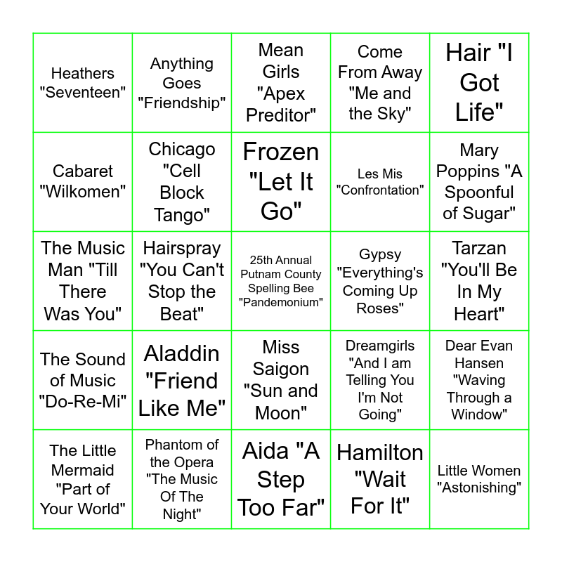 This bingo card has 50 words: West Side Story "Jet Song", 25th Annual Putnam County Spelling Bee "Pandemonium", A Funny Thing Happened on the Way to the Forum "Comedy Tonight", Aida "A Step Too Far", Aladdin "Friend Like Me", Annie Get Your Gun "There's No Business Like Show Business", Anything Goes "Friendship", Bye Bye Birdie "Telephone Hour", Cabaret "Wilkomen", Carousel "You'll Never Walk Alone", Chicago "Cell Block Tango", Come From Away "Me and the Sky", Dear Evan Hansen "Waving Through a Window", Dreamgirls "And I am Telling You I'm Not Going", Fiddler on the Roof "To Life", Footloose "Holding out for a Hero!", Frozen "Let It Go", Gypsy "Everything's Coming Up Roses", Hadestown "Livin' it Up on Top", Hair "I Got Life", Hairspray "You Can't Stop the Beat", Hamilton "Wait For It", Heathers "Seventeen", Les Mis "Confrontation", Little Shop of Horrors "Feed Me (Git It!)", Little Women "Astonishing", Mary Poppins "A Spoonful of Sugar", Matilda "Naughty", Mean Girls "Apex Preditor", Miss Saigon "Sun and Moon", Moulin Rouge "Come What May", Next To Normal "I'm Alive", Parade "It's Not Over Yet", Peter Pan "Never Never Land", Phantom of the Opera "The Music Of The Night", SIX "Ex-Wives", Spongebob Squarepants "Bikini Bottom Day", Spring Awakening "Don't Do Sadness/Blue Wind", Sunday in the Park with George, Tarzan "You'll Be In My Heart", The Addams Family "The Moon and Me", The King & I "I Whistle a Happy Tune", The Light in the Piazza "The Light in the Piazza", The Lion King "Be Prepared", The Little Mermaid "Part of Your World", The Music Man "Till There Was You", The Pirates of Penzance "I am the Very Model of a Modern Major General", The Producers "We Can Do It", The Sound of Music "Do-Re-Mi" and Thoroughly Modern Millie "Thoroughly Modern Millie".