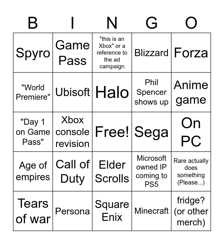 This bingo card has a free space and 24 words: Call of Duty, Persona, Halo, Tears of war, Forza, Spyro, "World Premiere", Game Pass, Sega, Elder Scrolls, Phil Spencer shows up, "Day 1 on Game Pass", Microsoft owned IP coming to PS5, Rare actually does something (Please...), Ubisoft, Minecraft, On PC, "this is an Xbox" or a reference to the ad campaign, Anime game, Xbox console revision, fridge? (or other merch), Age of empires, Blizzard and Square Enix.