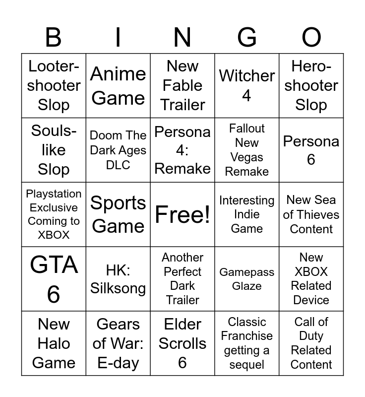 This bingo card has a free space and 24 words: HK: Silksong, Gears of War: E-day, Persona 4: Remake, New Halo Game, Hero-shooter Slop, Looter-shooter Slop, Souls-like Slop, Anime Game, Interesting Indie Game, Another Perfect Dark Trailer, Fallout New Vegas Remake, Playstation Exclusive Coming to XBOX, Gamepass Glaze, New XBOX Related Device, Doom The Dark Ages DLC, Classic Franchise getting a sequel, New Sea of Thieves Content, New Fable Trailer, Persona 6, Sports Game, Call of Duty Related Content, GTA 6, Witcher 4 and Elder Scrolls 6.