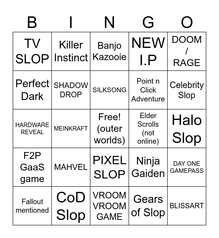 This bingo card has a free space and 24 words: MAHVEL, CoD Slop, SILKSONG, Fallout mentioned, DOOM / RAGE, TV SLOP, Perfect Dark, Killer Instinct, Elder Scrolls (not online), PIXEL SLOP, Point n Click Adventure, HARDWARE REVEAL, Ninja Gaiden, DAY ONE GAMEPASS, SHADOW DROP, Gears of Slop, Halo Slop, Banjo Kazooie, Celebrity Slop, MEINKRAFT, BLISSART, F2P GaaS game, NEW I.P and VROOM VROOM GAME.