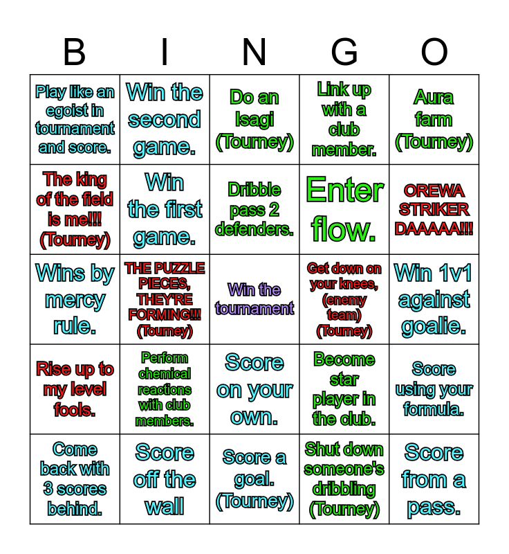 This bingo card has a free space and 24 words: Perform chemical reactions with club members., Score off the wall, Dribble pass 2 defenders., Come back with 3 scores behind., Aura farm (Tourney), Play like an egoist in tournament and score., The king of the field is me!!! (Tourney), Win the second game., Get down on your knees, (enemy team) (Tourney), Score on your own., Enter flow., Wins by mercy rule., Become star player in the club., Score using your formula., Win the first game., Shut down someone's dribbling (Tourney), Win 1v1 against goalie., Do an Isagi (Tourney), OREWA STRIKER DAAAAA!!!, THE PUZZLE PIECES, THEY'RE FORMING!!! (Tourney), Score from a pass., Rise up to my level fools., Link up with a club member. and Score a goal. (Tourney).
