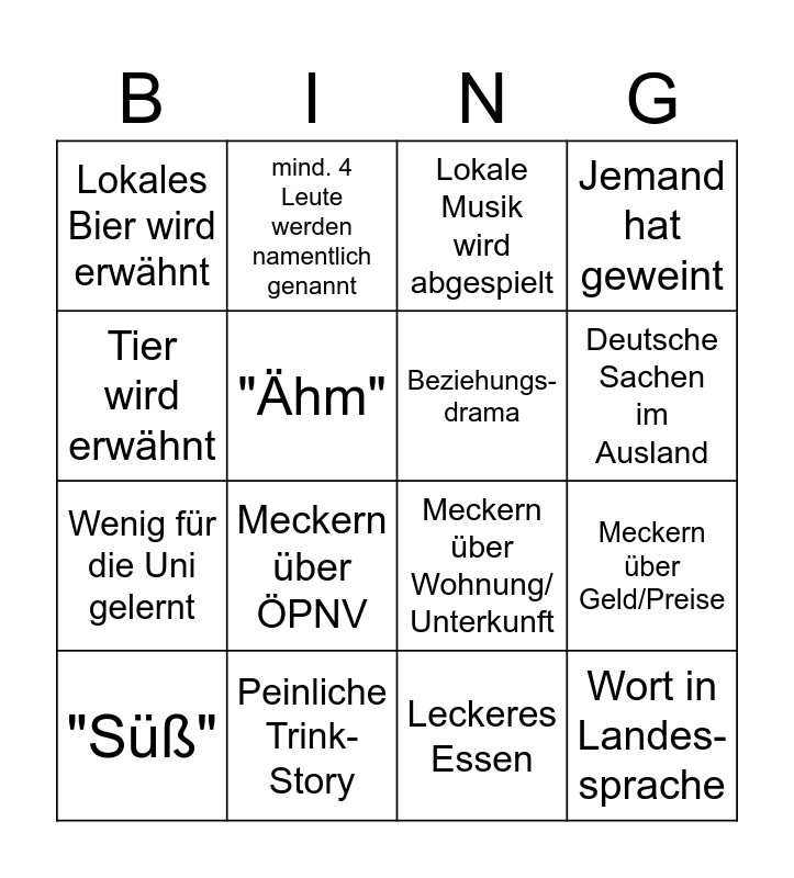 This bingo card has 16 words: Peinliche Trink- Story, Meckern über Geld/Preise, Lokale Musik wird abgespielt, Lokales Bier wird erwähnt, Wenig für die Uni gelernt, mind. 4 Leute werden namentlich genannt, Meckern über Wohnung/ Unterkunft, Leckeres Essen, Tier wird erwähnt, "Ähm", "Süß", Jemand hat geweint, Meckern über ÖPNV, Deutsche Sachen im Ausland, Beziehungs- drama and Wort in Landes-sprache.