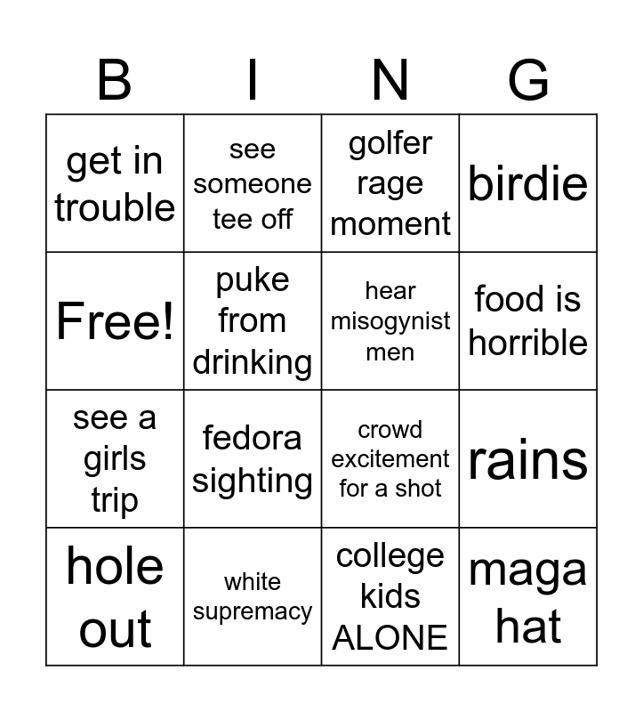 This bingo card has 16 words: white supremacy, rains, golfer rage moment, get in trouble, see a girls trip, see someone tee off, crowd excitement for a shot, college kids ALONE, Free!, puke from drinking, hole out, birdie, fedora sighting, food is horrible, hear misogynist men and maga hat.