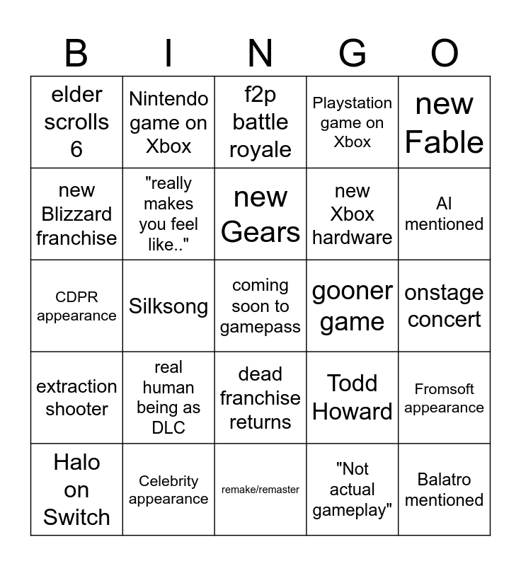 This bingo card has a free space and 29 words: Halo on Switch, Hades 2 release date, Silksong, new D&D game, elder scrolls 6, f2p battle royale, "really makes you feel like..", real human being as DLC, gooner game, Celebrity appearance, onstage concert, Balatro mentioned, remake/remaster, "Not actual gameplay", AI mentioned, new Halo, dead franchise returns, extraction shooter, new Fable, CDPR appearance, Todd Howard, Phil Spencer graphic tee, new Xbox hardware, new Blizzard franchise, Playstation game on Xbox, Nintendo game on Xbox, Fromsoft appearance, new Gears and Gamepass price increase.