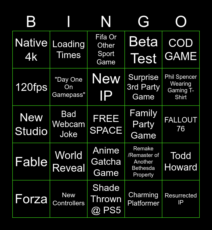 This bingo card has a free space and 24 words: World Reveal, New Controllers, New IP, Forza, COD GAME, Native 4k, 120fps, Loading Times, Family Party Game, Anime Gatcha Game, Surprise 3rd Party Game, New Studio, Remake /Remaster of Another Bethesda Property, Todd Howard, "Day One On Gamepass", Charming Platformer, FALLOUT 76, Fifa Or Other Sport Game, Phil Spencer Wearing Gaming T-Shirt, Bad Webcam Joke, Resurrected IP, Fable, Beta Test and Shade Thrown @ PS5.