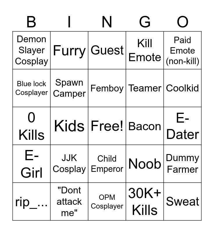 This bingo card has a free space and 24 words: JJK Cosplay, "Dont attack me", Femboy, rip_..., Paid Emote (non-kill), Demon Slayer Cosplay, Blue lock Cosplayer, Furry, Bacon, Child Emperor, Teamer, 0 Kills, Noob, Dummy Farmer, Spawn Camper, 30K+ Kills, E-Dater, Guest, Coolkid, Kids, Sweat, E-Girl, Kill Emote and OPM Cosplayer.