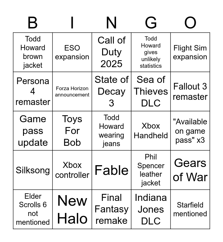 This bingo card has a free space and 24 words: Xbox controller, New Halo, State of Decay 3, Elder Scrolls 6 not mentioned, Flight Sim expansion, Todd Howard brown jacket, Persona 4 remaster, ESO expansion, Xbox Handheld, Fable, Sea of Thieves DLC, Game pass update, Phil Spencer leather jacket, Gears of War, Forza Horizon announcement, Indiana Jones DLC, "Available on game pass" x3, Call of Duty 2025, Fallout 3 remaster, Toys For Bob, Starfield mentioned, Silksong, Todd Howard gives unlikely statistics and Final Fantasy remake.