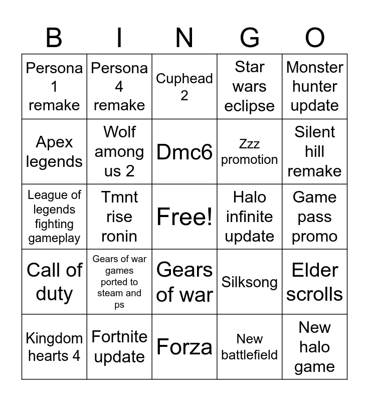 This bingo card has a free space and 24 words: Gears of war games ported to steam and ps, Fortnite update, Dmc6, Kingdom hearts 4, Monster hunter update, Persona 1 remake, Apex legends, Persona 4 remake, Halo infinite update, Gears of war, Zzz promotion, League of legends fighting gameplay, Silksong, Elder scrolls, Wolf among us 2, New battlefield, Game pass promo, Cuphead 2, Silent hill remake, Tmnt rise ronin, New halo game, Call of duty, Star wars eclipse and Forza.